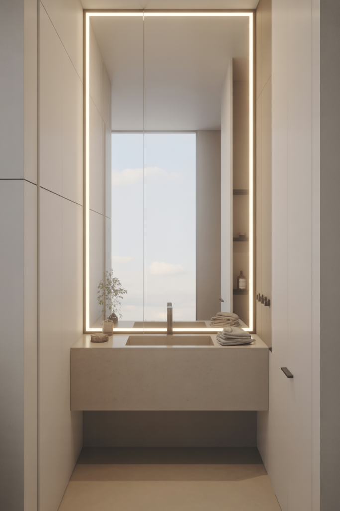 Keep finishes simple: large-format tiles, light neutral paint, and minimal trim reduce visual clutter. A single large mirror above the vanity doubles perceived space and boosts light.