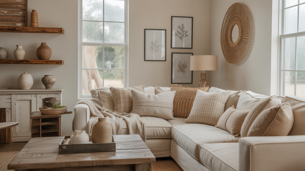 Next, think about the color scheme. Neutral colors like white, beige, and gray are common in farmhouse style. These shades blend easily with other decorations and create a calm atmosphere.