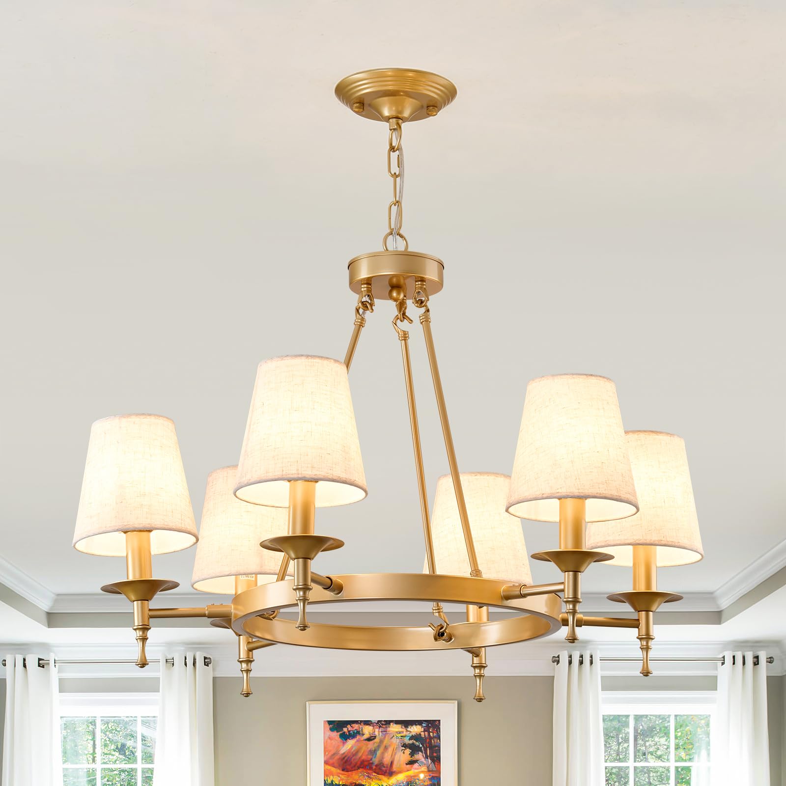 We found this chandelier brings a cozy farmhouse vibe right away. The brass finish looks solid and the fabric shades soften the light just right. It made our dining area feel inviting without being bright or harsh.