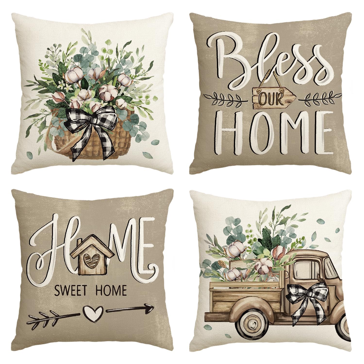 We found these pillow covers change the look of our couch without much effort. The zipper is smooth and the covers slipped on quickly. The colors and patterns bring a nice rustic vibe, especially with the “Home Sweet Home” and eucalyptus leaf designs.