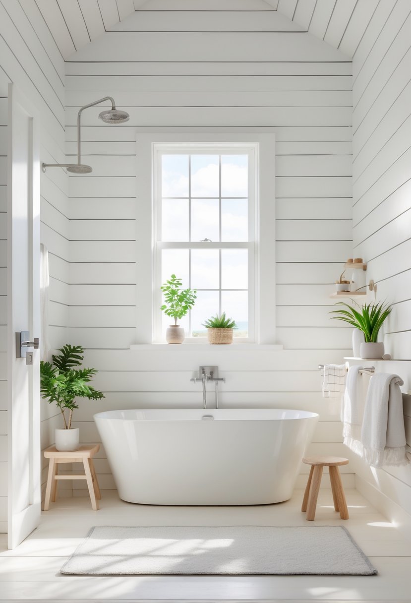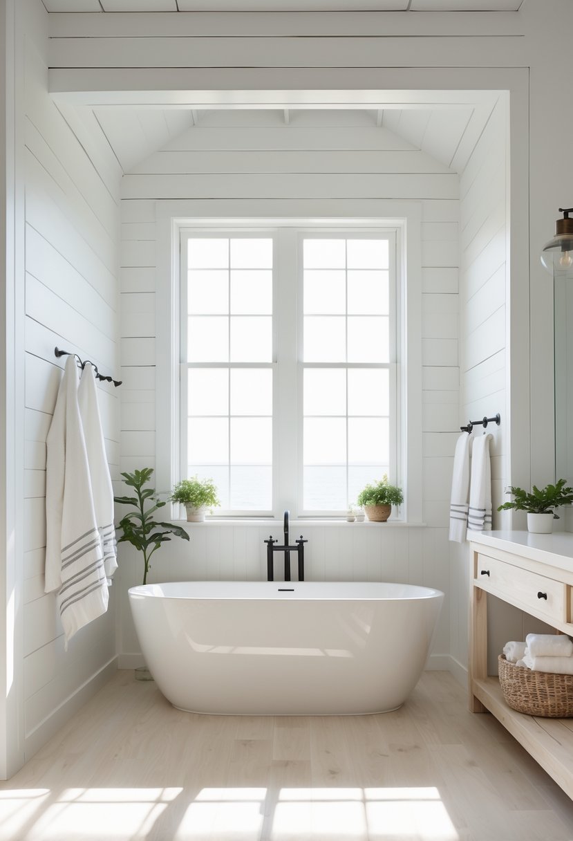 White shiplap walls create a fresh and open feel in a coastal farmhouse bathroom. The crisp white color brightens the space, making it feel larger and airier.