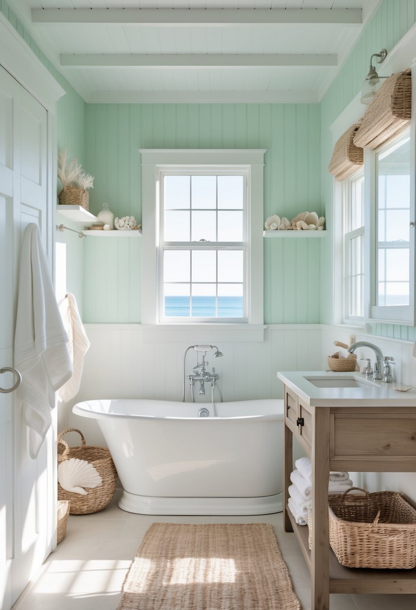 Seafoam green paint adds a soft, fresh feeling to a coastal farmhouse bathroom. Its light blue-green shade brings a sense of calm and brightness into the space.