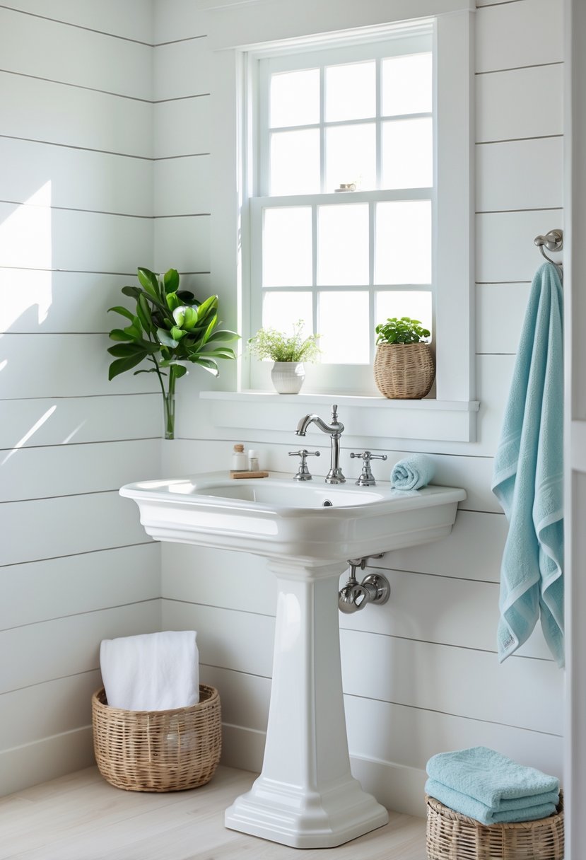 A pedestal sink adds a simple, timeless look to a coastal farmhouse bathroom. It saves space and keeps the room feeling open and uncluttered.