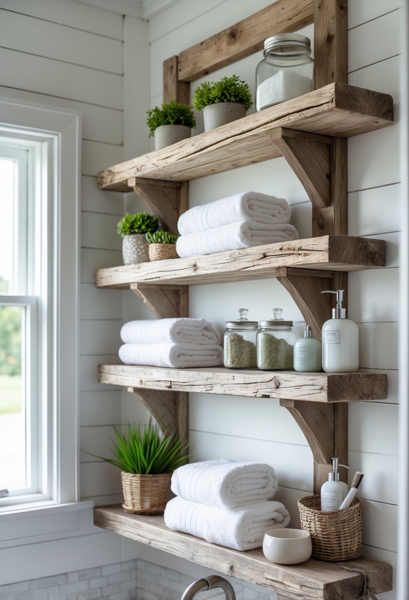 5) Weathered wood shelving for rustic warmth