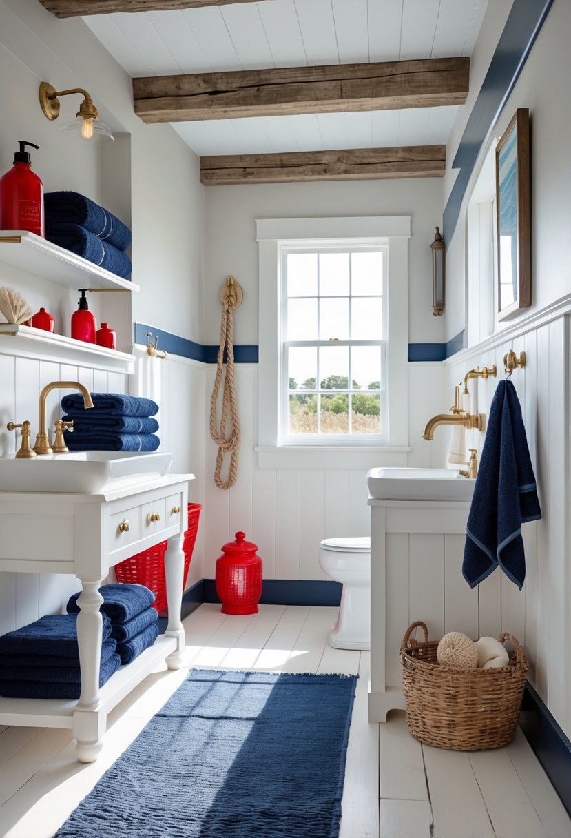 Simple touches like striped towels, red hardware, or small decor items can give the room character. These elements connect the design firmly to a seaside theme without overwhelming the farmhouse charm.