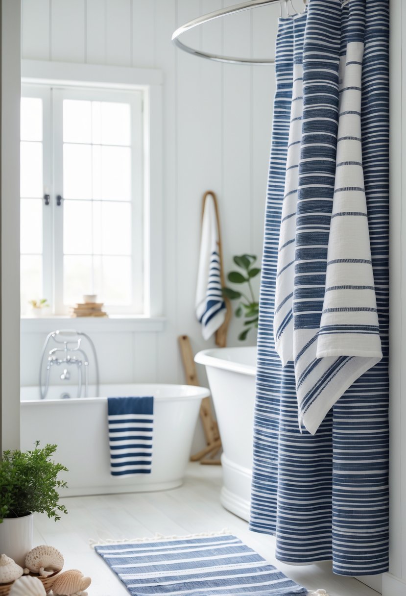 Striped patterns bring a clear maritime feel to a coastal farmhouse bathroom. They work well on towels, shower curtains, and rugs. The classic navy and white stripes echo traditional sailor uniforms and ship designs.
