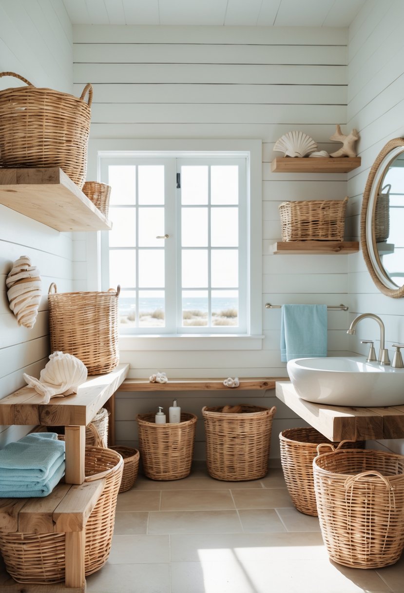 Wicker baskets add natural texture to a coastal farmhouse bathroom. Made from materials like rattan, seagrass, or water hyacinth, they blend well with earthy tones and rustic decor.