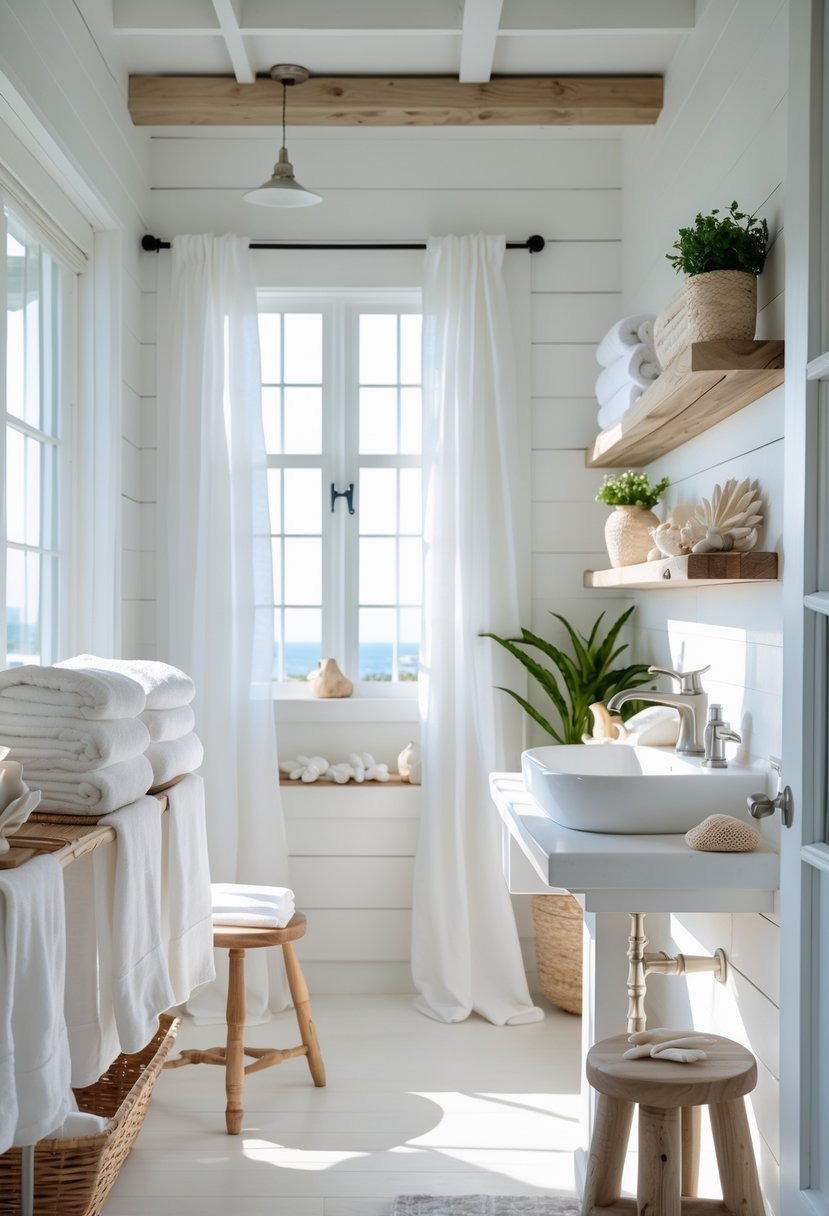 Soft white linens bring a fresh and clean look to a coastal farmhouse bathroom. They add a light, airy feel that reflects natural beachside calm.