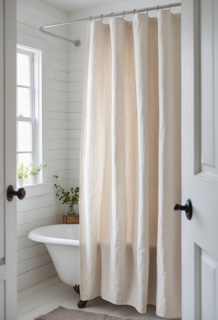 A soft linen shower curtain adds a calm and natural look to a small farmhouse bathroom. It is usually made of a mix of linen and polyester, making it gentle to touch and easy to clean.