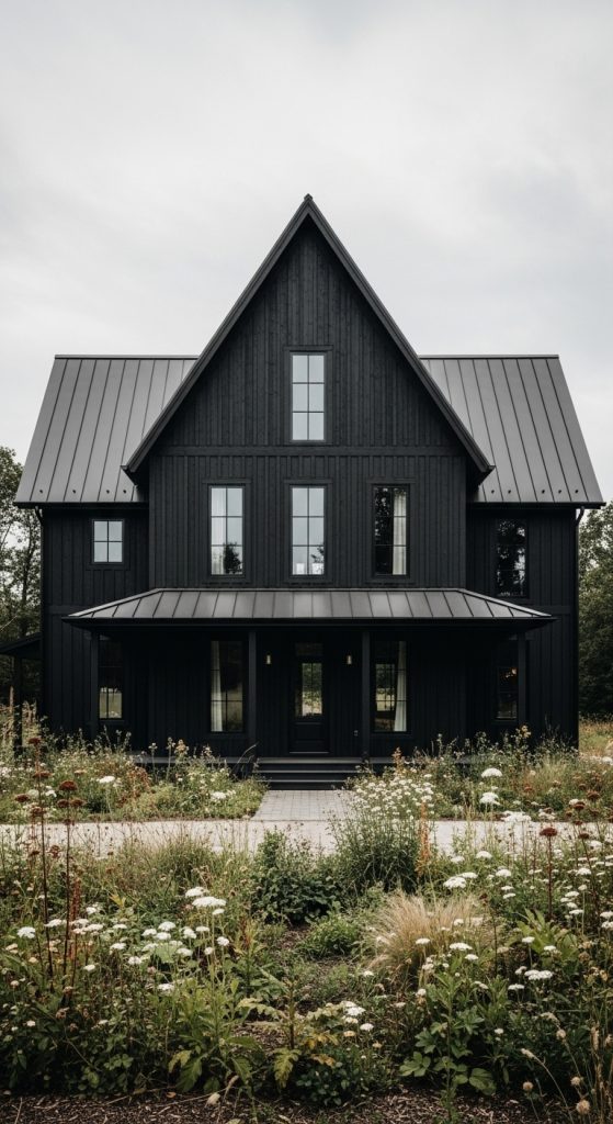 A deep black exterior with vertical board-and-batten siding gives this farmhouse a strong Gothic presence. Steep gables, dark window frames, and a simple metal roof create a bold silhouette that feels both modern and timeless in rural settings.