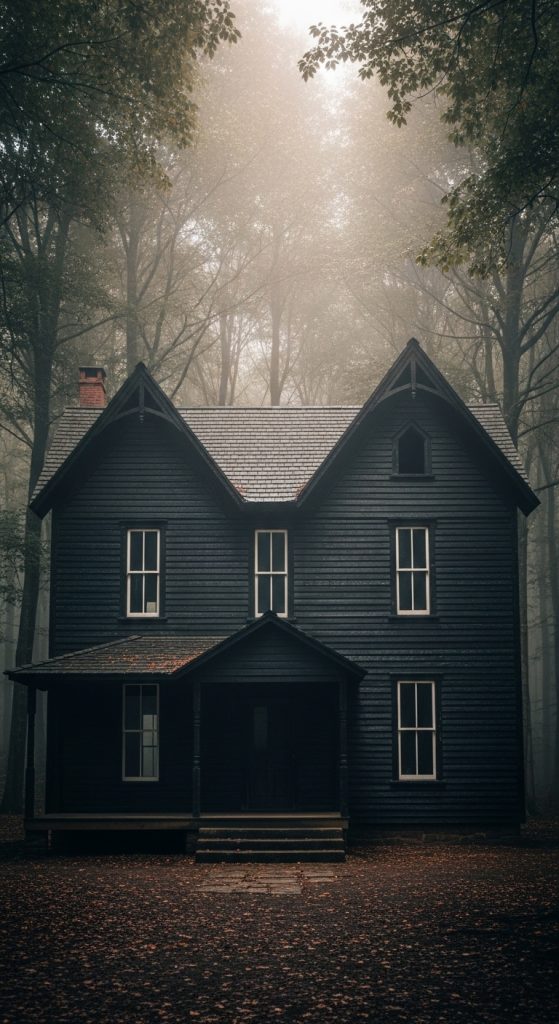 A combination of dark siding and natural stone creates contrast and depth across the exterior. The stone base grounds the home, while the black upper sections keep the Gothic drama alive.