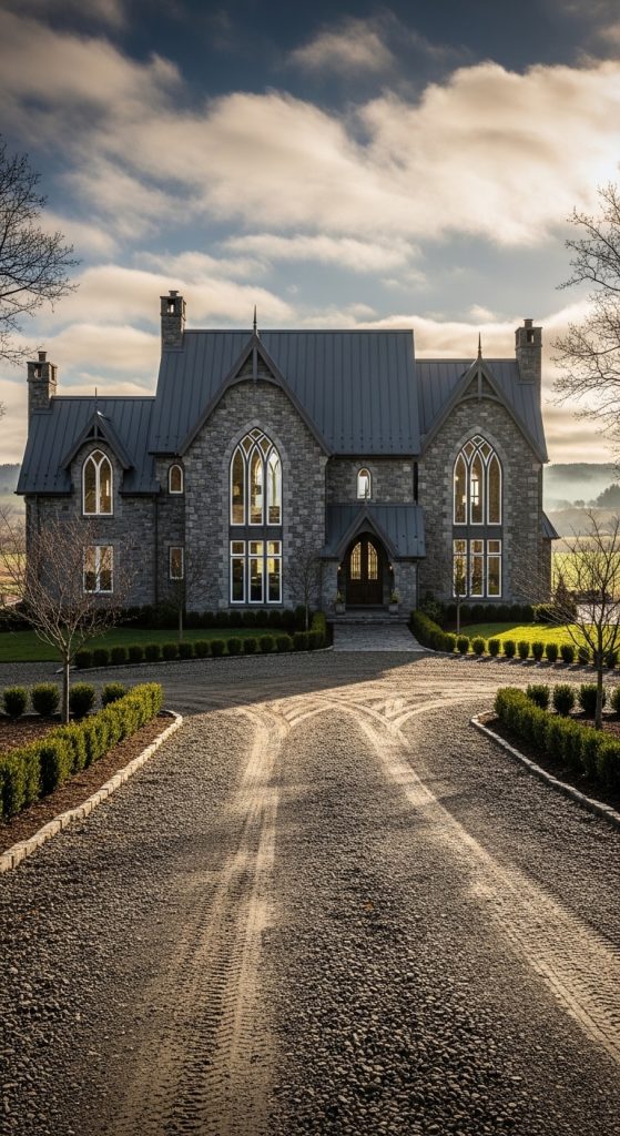 A Gothic farmhouse becomes even more striking when paired with moody landscaping. Gravel paths, tall grasses, stone steps, and dark fencing enhance the dramatic exterior and complete the overall look.