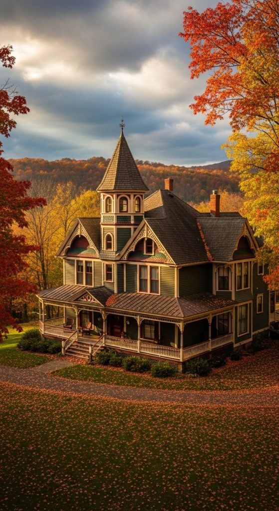 This exterior blends Victorian farmhouse charm with Gothic details like pointed windows, decorative trim, and tower-style roof elements. The result is a home that feels historic, elegant, and full of personality.
