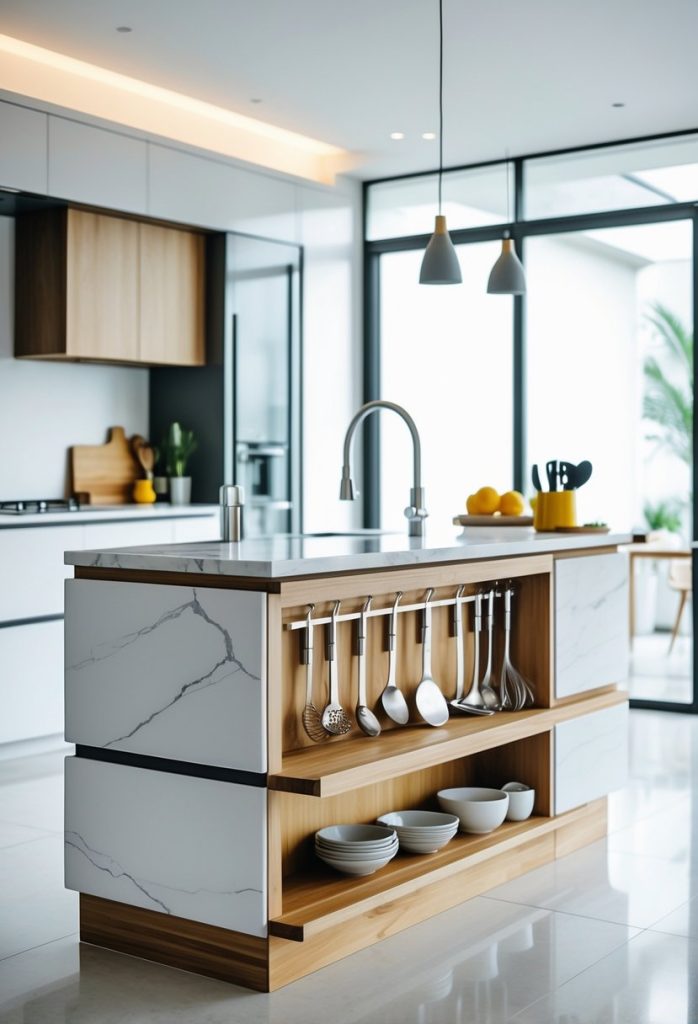 Choose hooks and tiers that match your kitchen style and height. That way the island stays useful and looks pulled together.