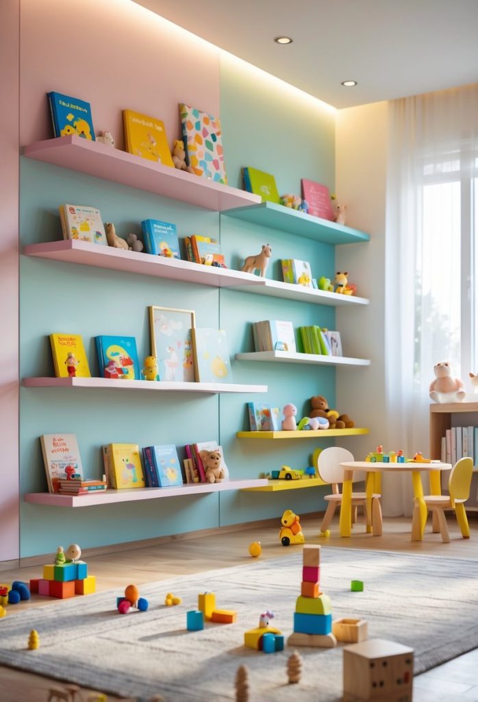 They mount to the wall and free floor space, so playrooms feel less cluttered. Floating shelves work well for picture books, small toys, and favorite keepsakes.