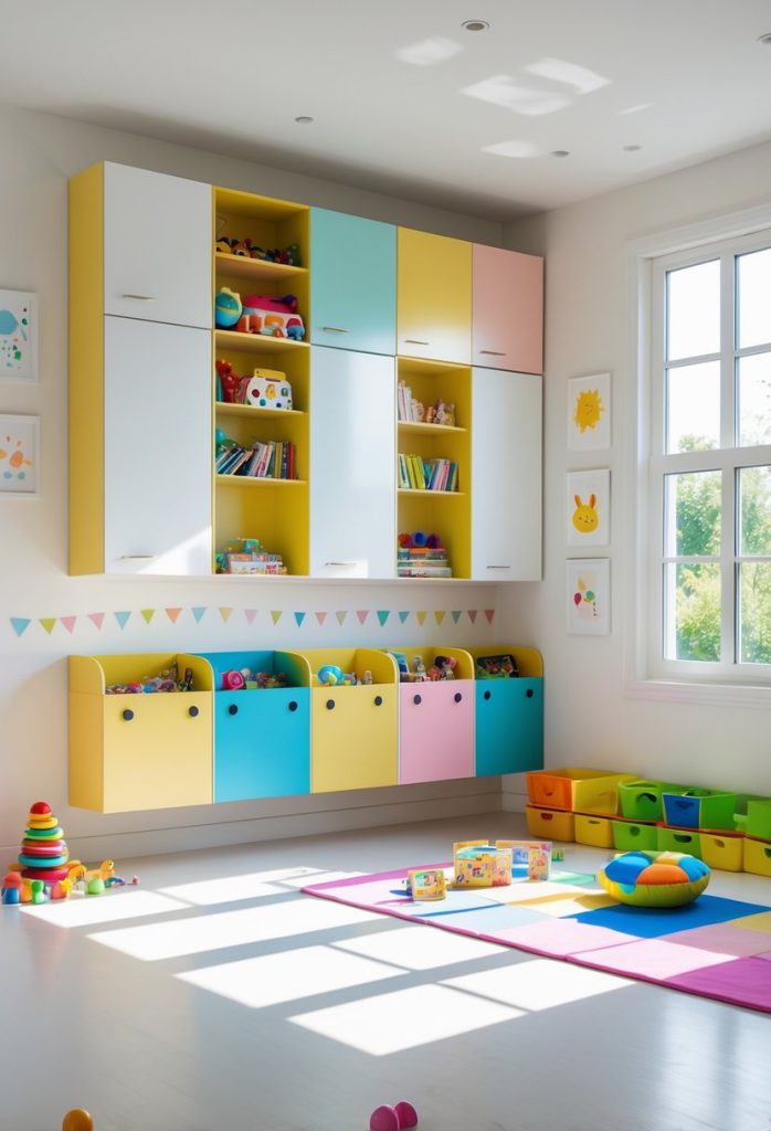 Mount wall cabinets above play areas to free floor space and store items out of reach. Use shallow, closed cabinets to keep a tidy look without crowding the room.