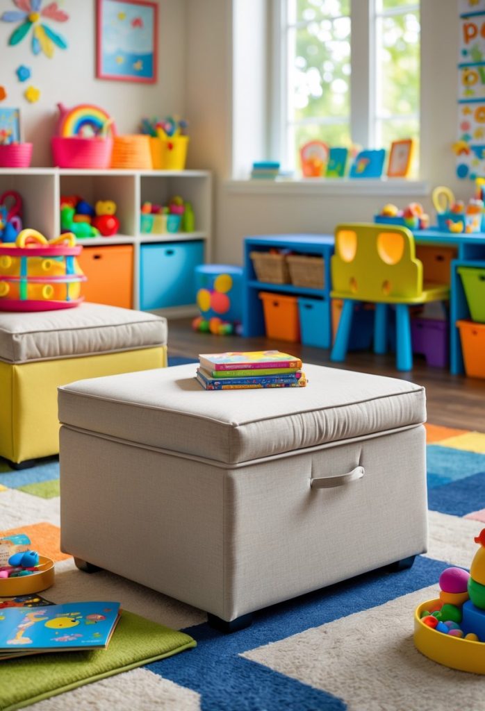 A storage ottoman gives a seat and a hidden bin in one simple piece. It keeps toys and blankets tucked away while also adding a soft spot for reading or resting feet.