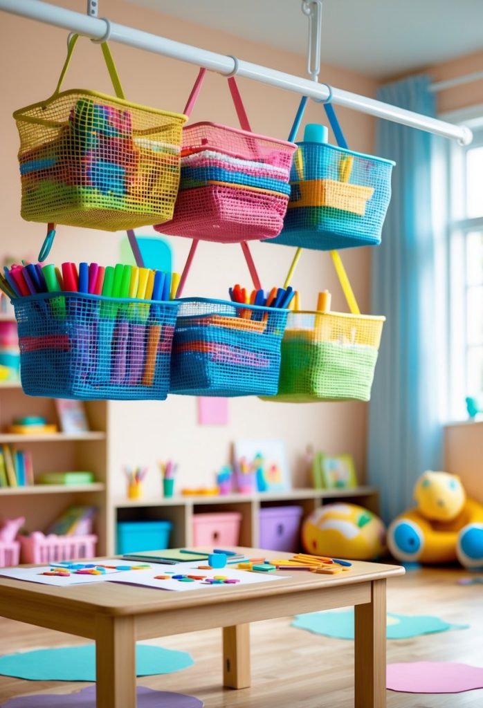 They hang from hooks or a rod, keeping markers, glue sticks, and scissors visible and reachable. Mesh sides let caregivers see contents quickly and air dries paintbrushes.