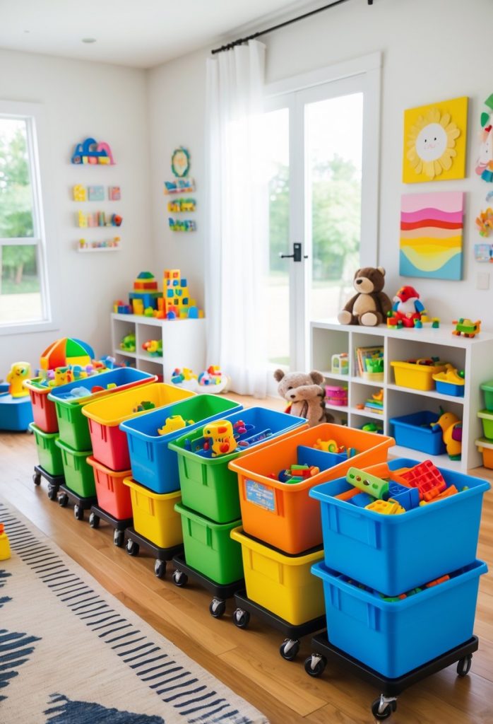 Choose rolling drawers or repurposed dresser drawers with casters for easy access. Clear or labeled bins help kids find things quickly and put them away.