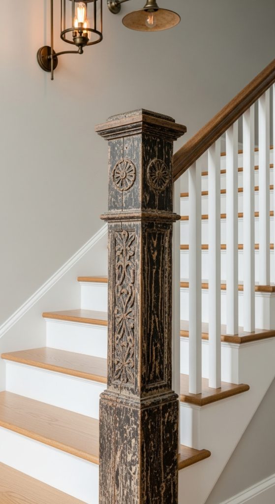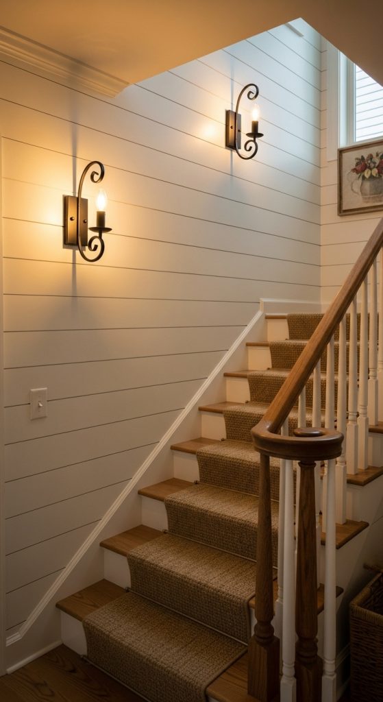 Lighting makes a big impact. Choose rustic sconces, lantern lights, or vintage-inspired fixtures to flank your staircase.