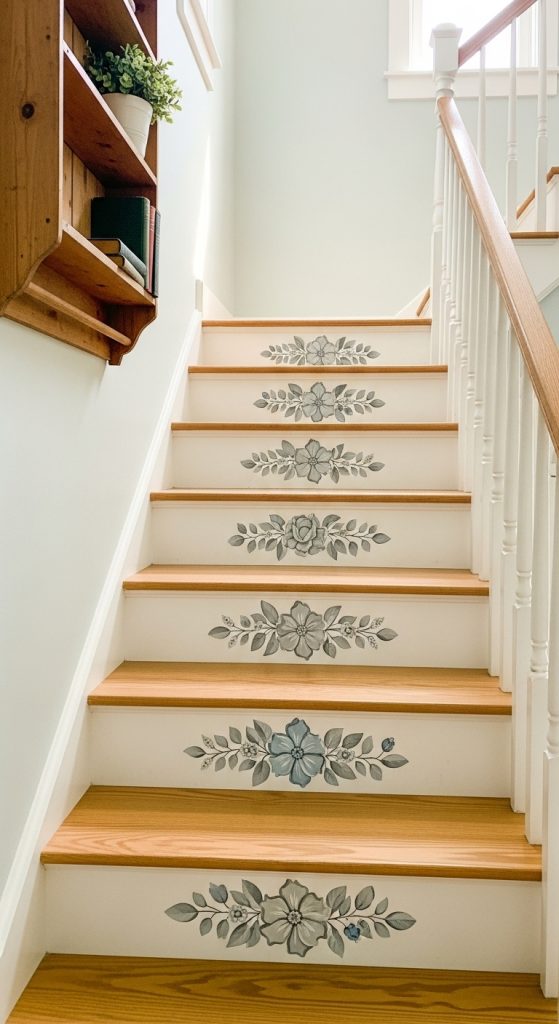 Get creative with stencils or hand-painted patterns on your stair risers. Florals, stripes, or quotes all add a sweet, farmhouse flair.