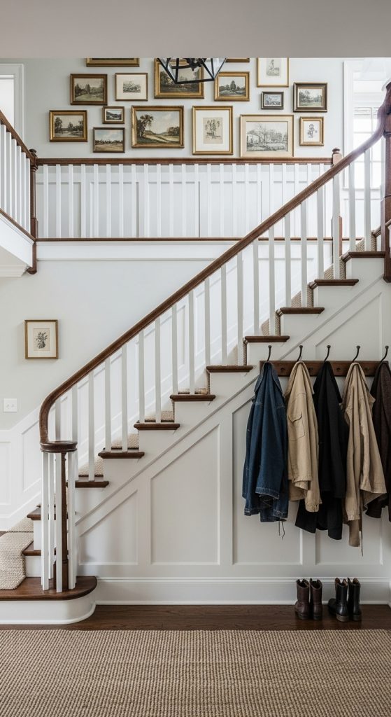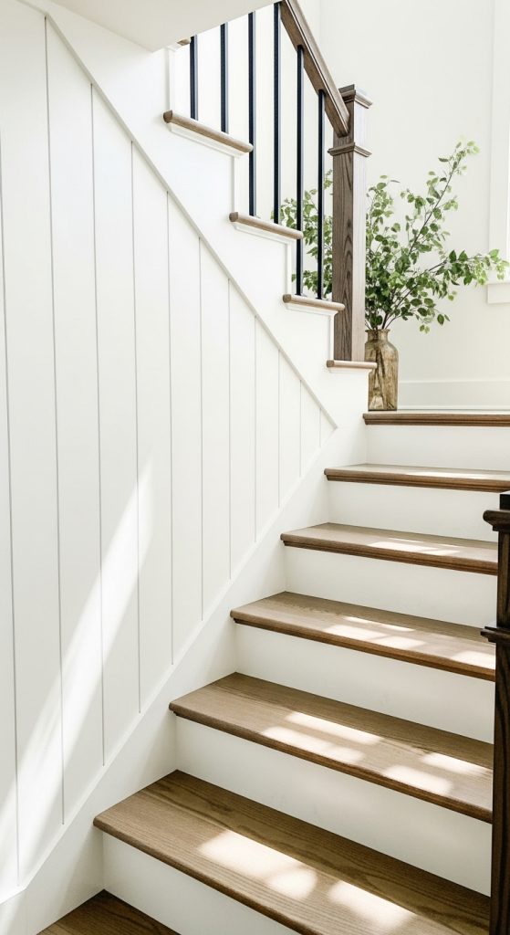 For elegance and charm, add classic wainscoting to the staircase wall. It makes the whole area feel polished and intentional.