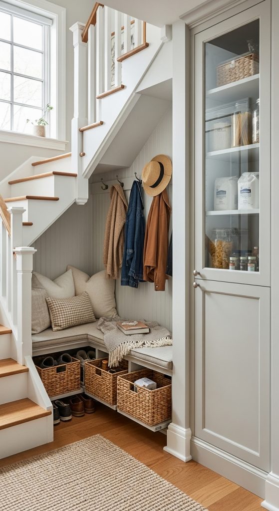 Under the stairs is the perfect spot for cozy built-ins. Add a reading nook, built-in bench, or even mini mudroom with hooks and baskets.