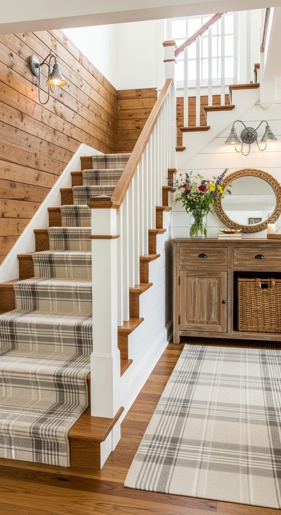 A cozy stair runner in jute, plaid, or faded floral can soften hardwood stairs. Choose warm, neutral tones for that cozy farmhouse feel. Bonus: it makes your stairs safer too.