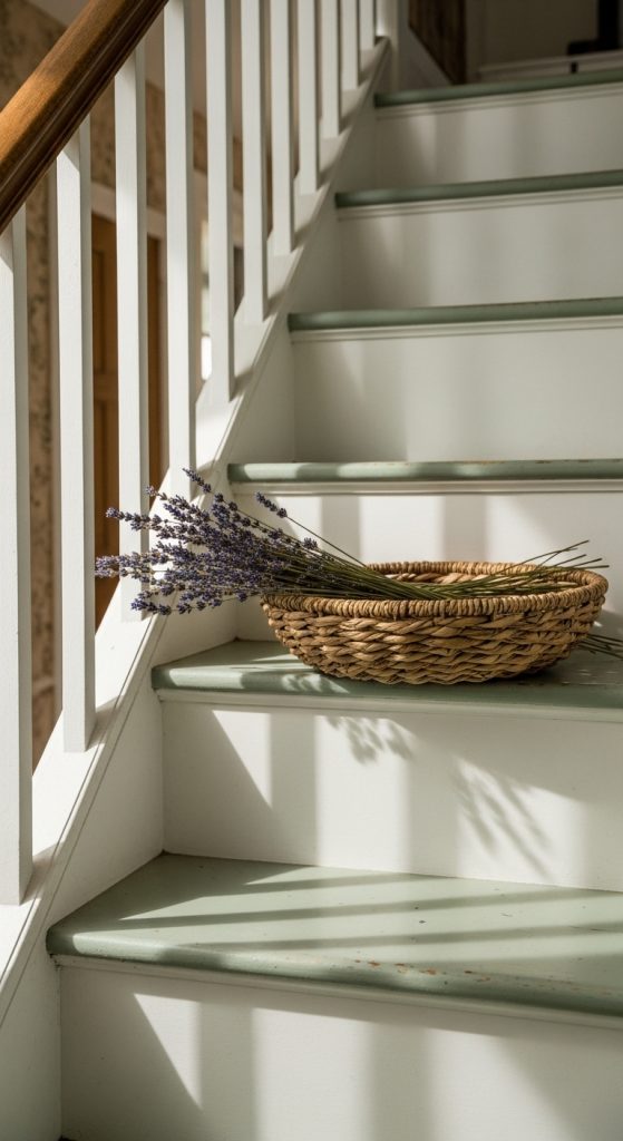 Painting your stairs in distressed white or soft sage green adds vintage charm. Light chipping or sanding on edges brings out a weathered, rustic look.