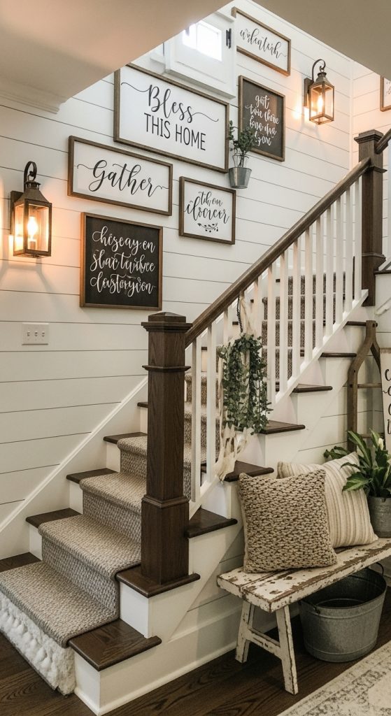 Add wooden signs with inspirational quotes or family names along your staircase wall. These signs feel personal and inviting, like a warm welcome to your guests.